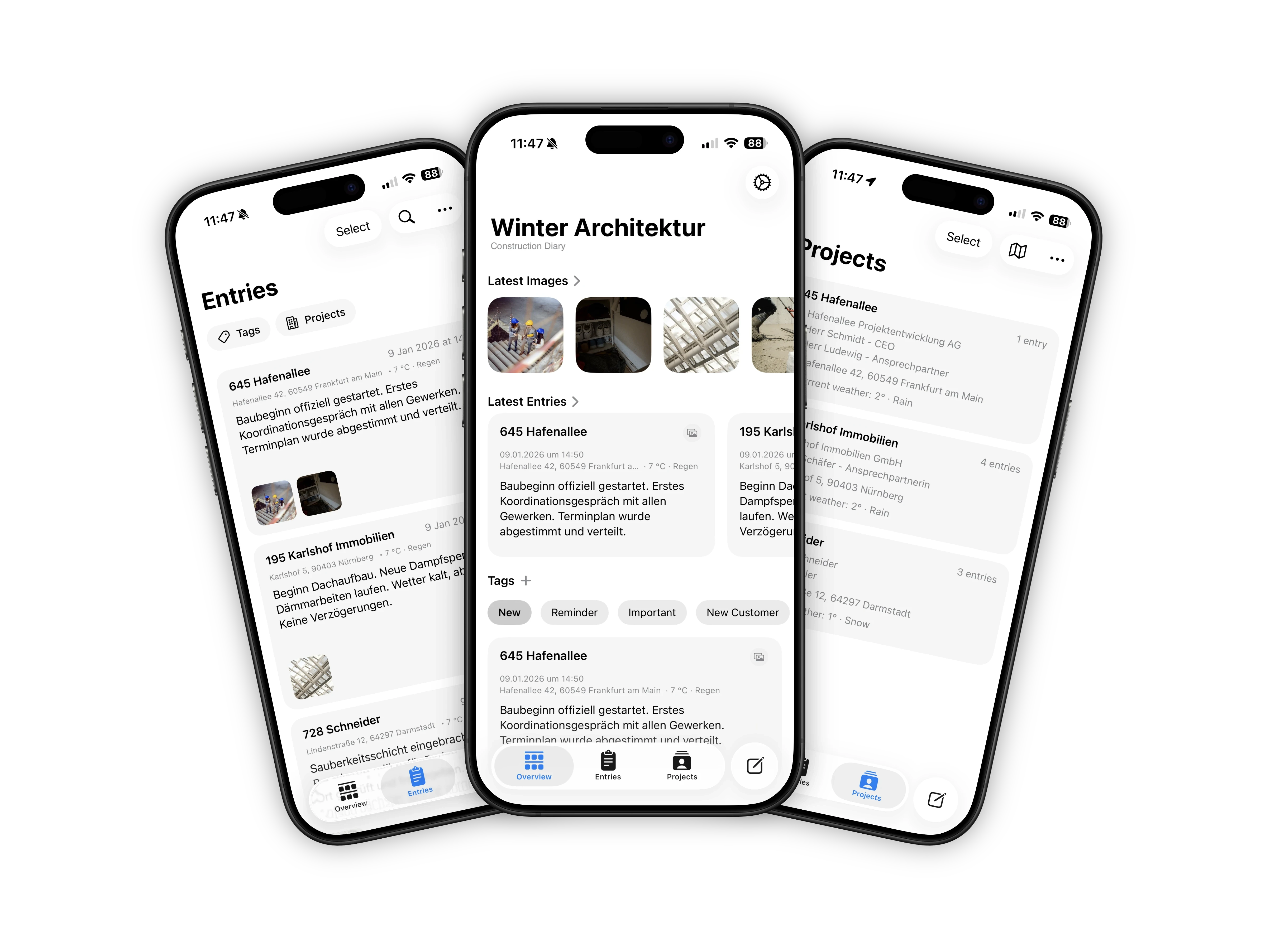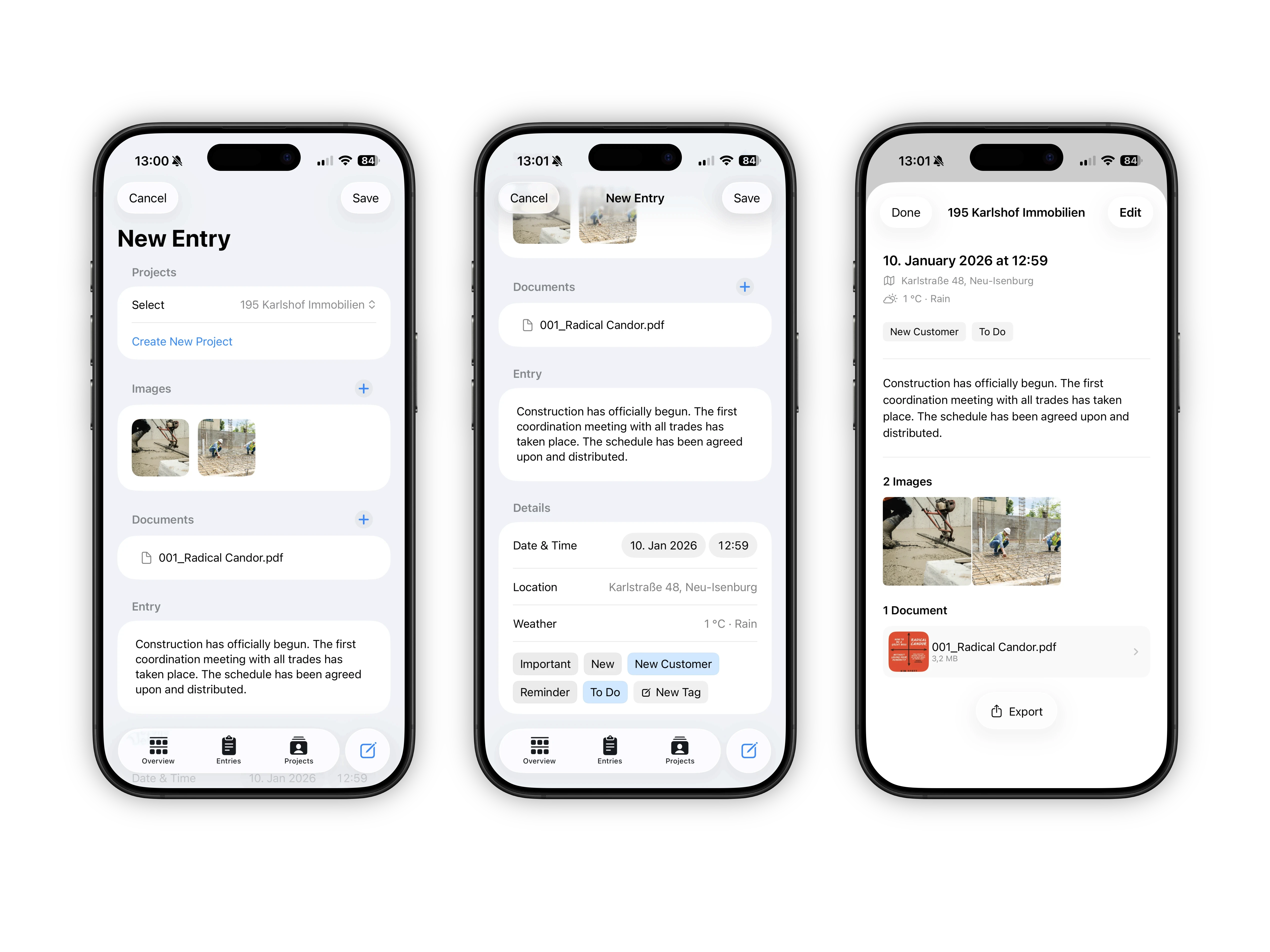 Create daily or project based entries with text, date, time, location, and weather. Manage any number of construction projects in parallel, clearly separated and easy to edit.
